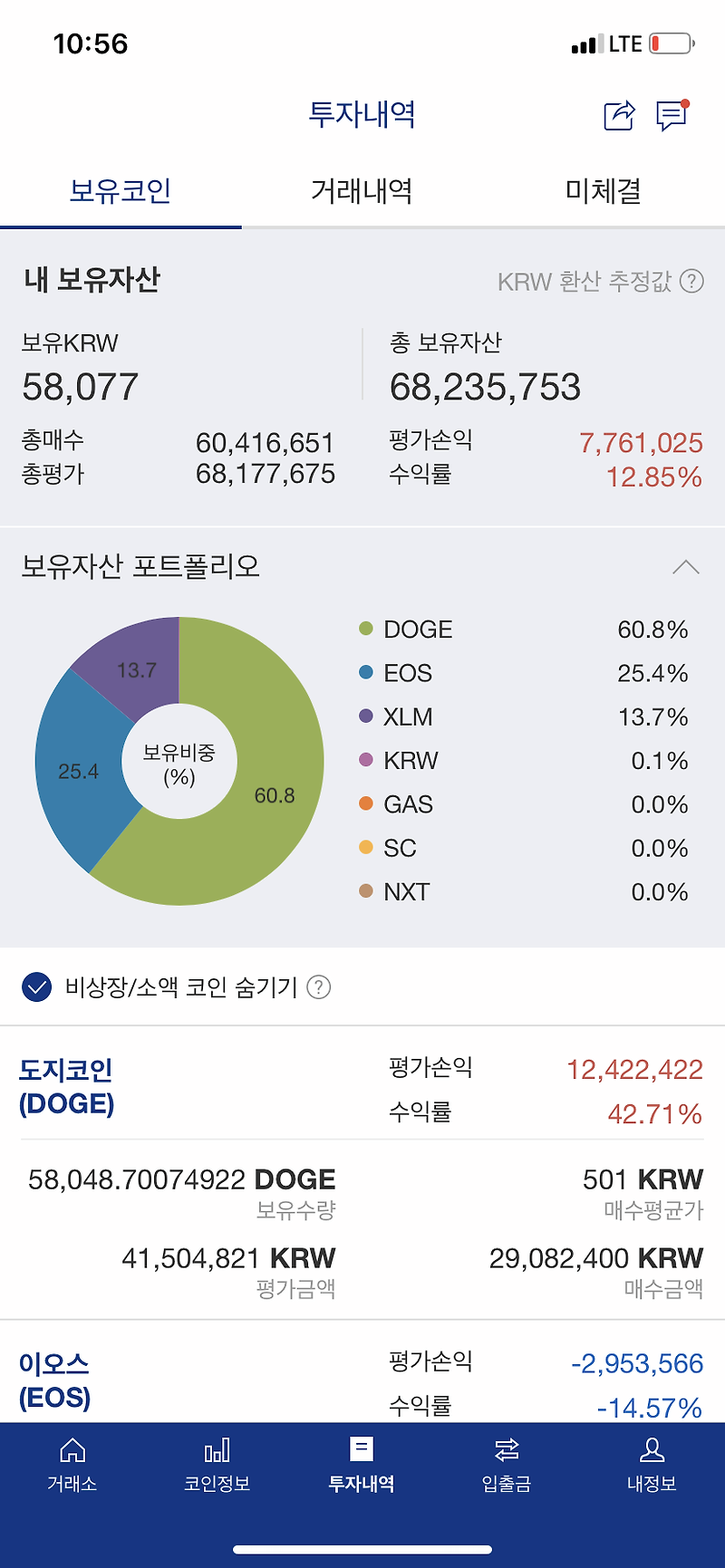 Doge)이 보이면 오른쪽의 입출금을 눌러준다.